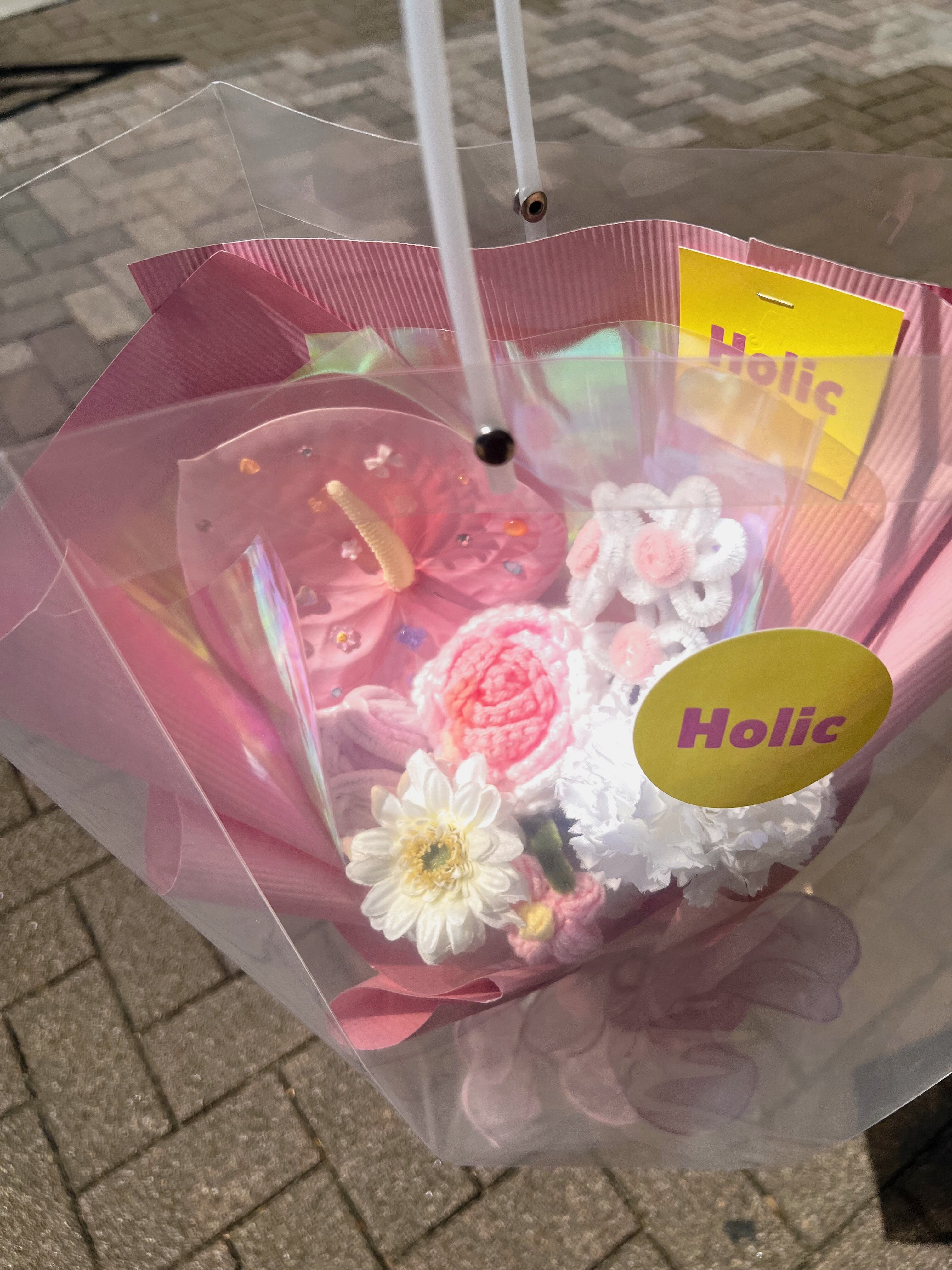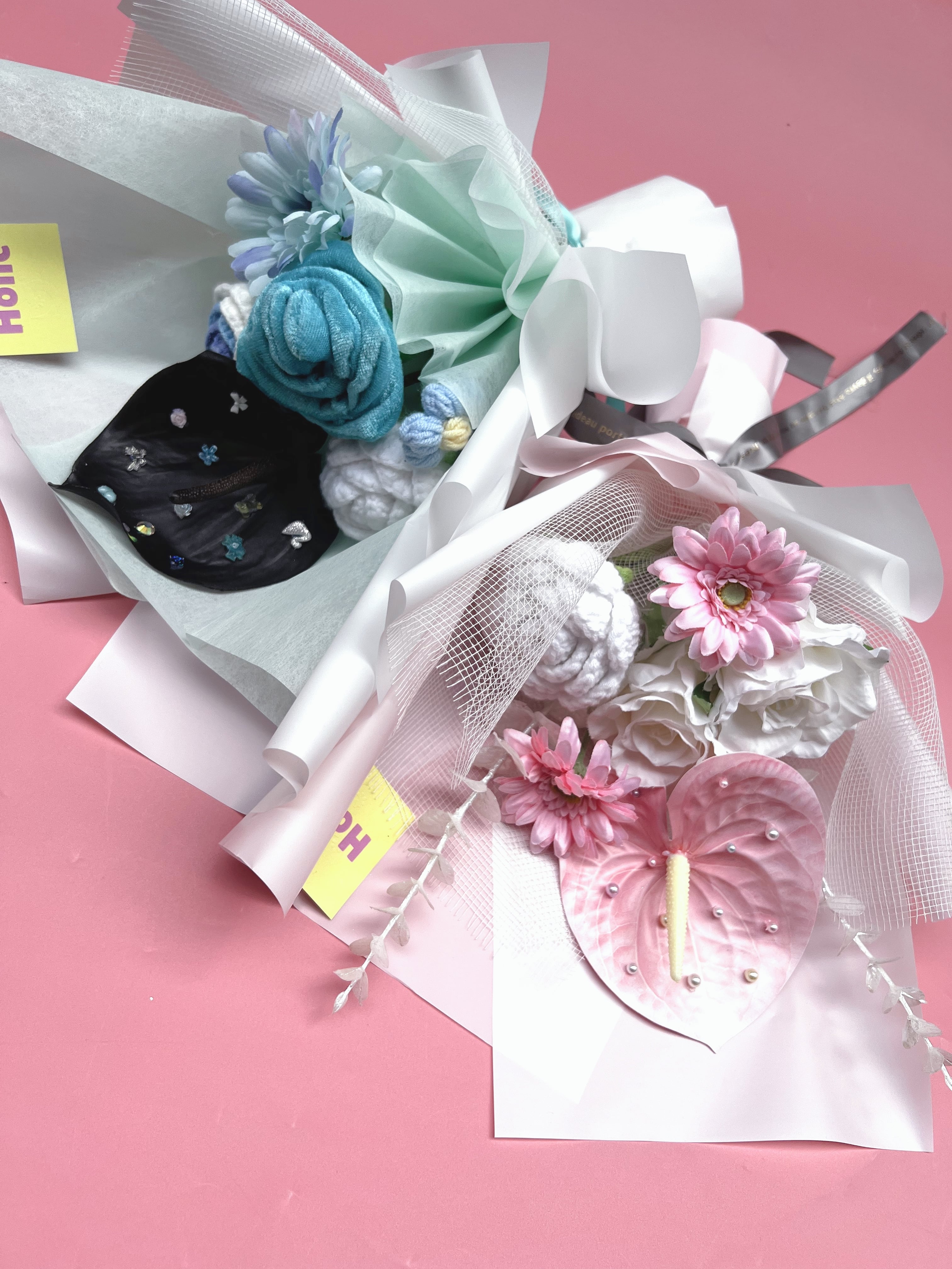 ニットフラワーとアーティフィシャルフラワー(造花)で作成した花束になります