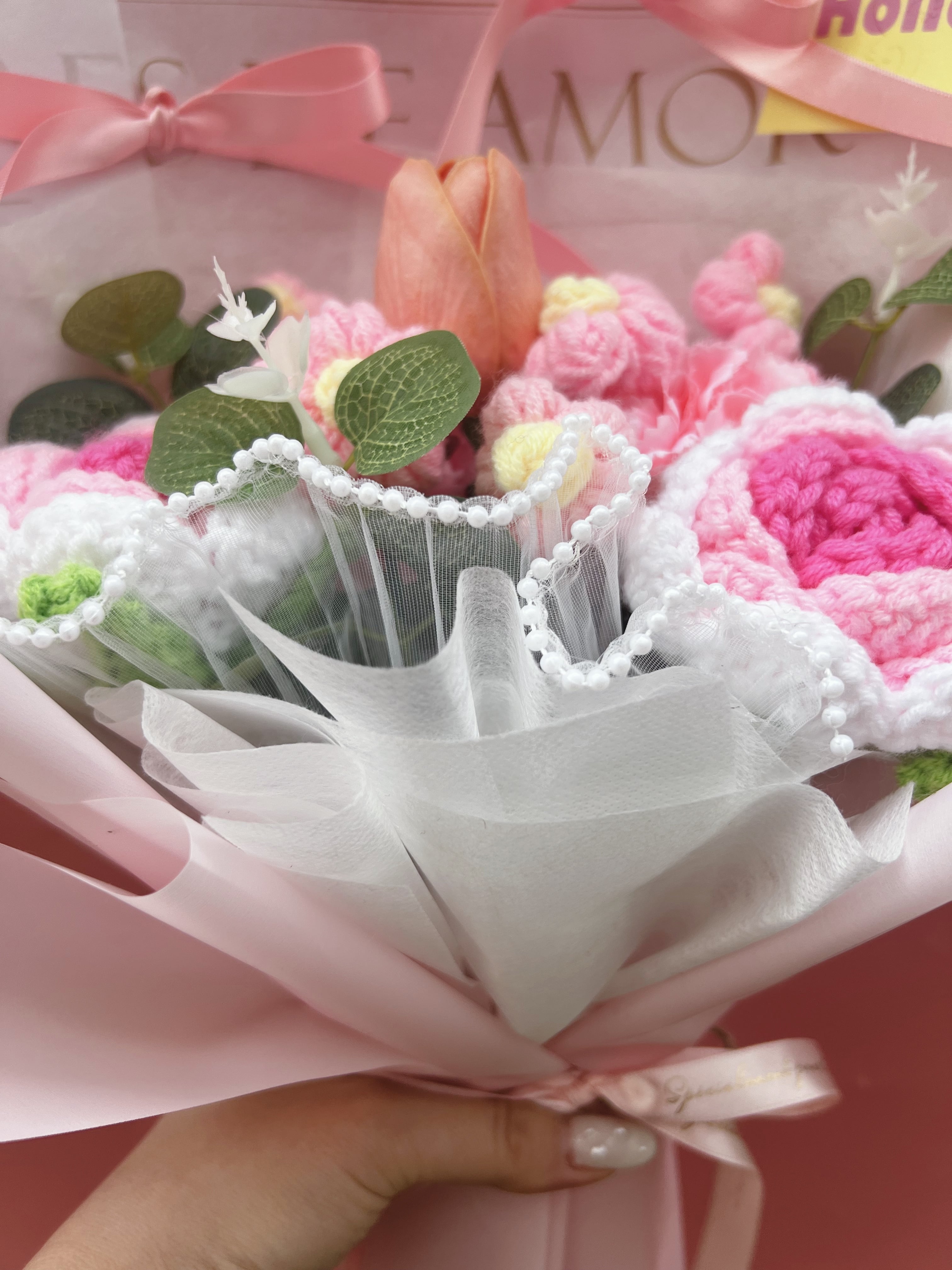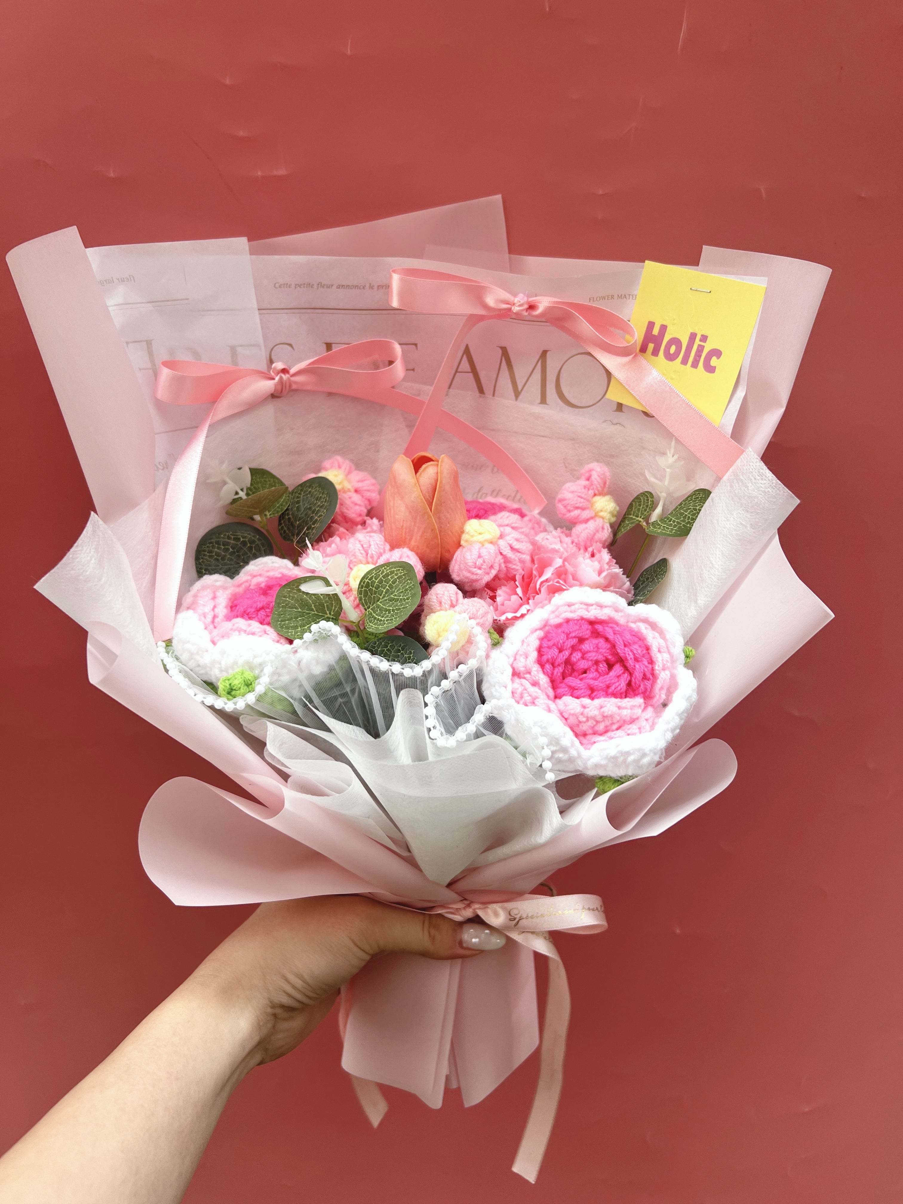 ニットフラワーとアーティフィシャルフラワー(造花)で作成した花束になります。