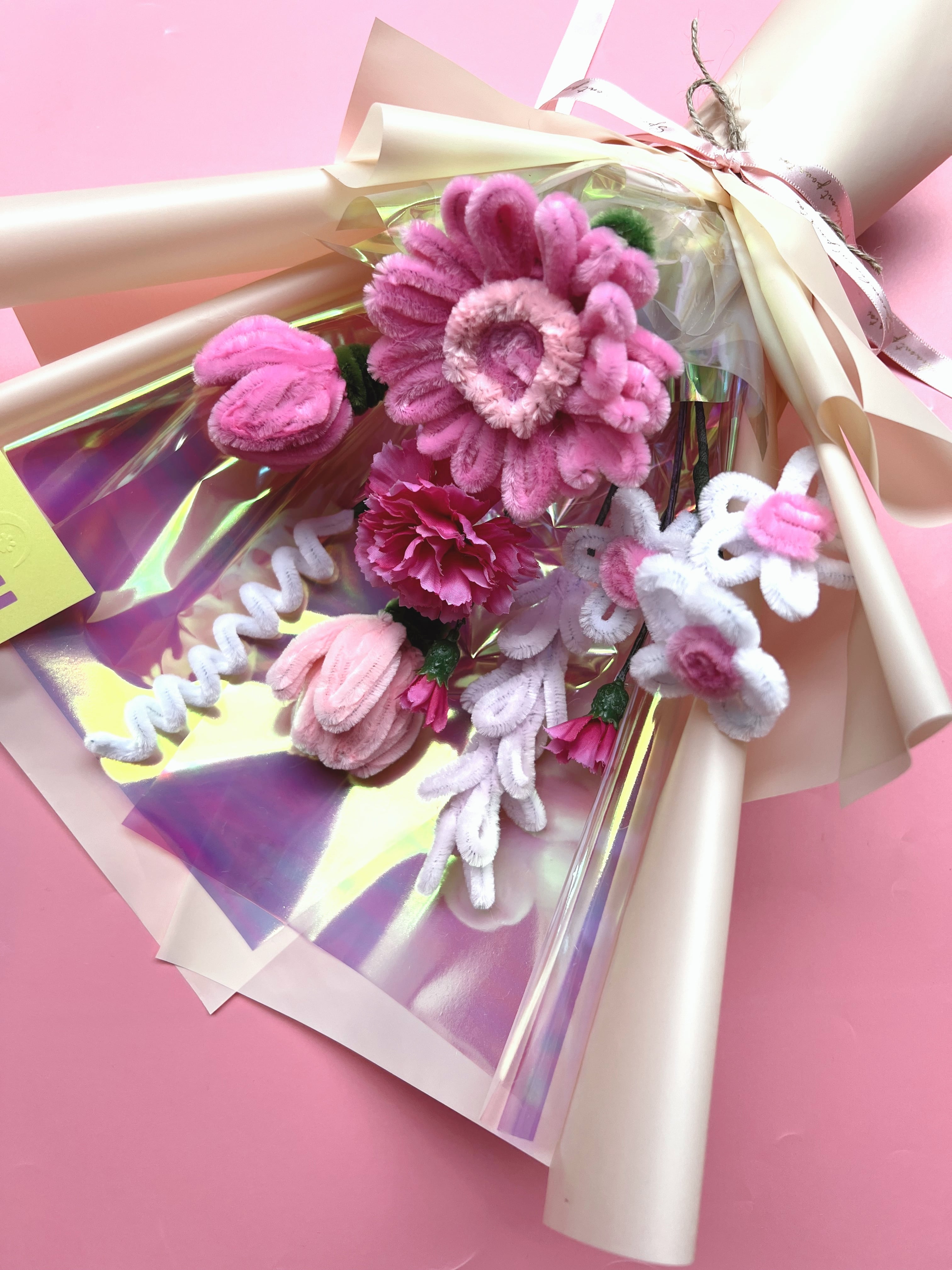 モールからできたモールフラワーとアーティフィシャルフラワー(造花)で作成した花束になります